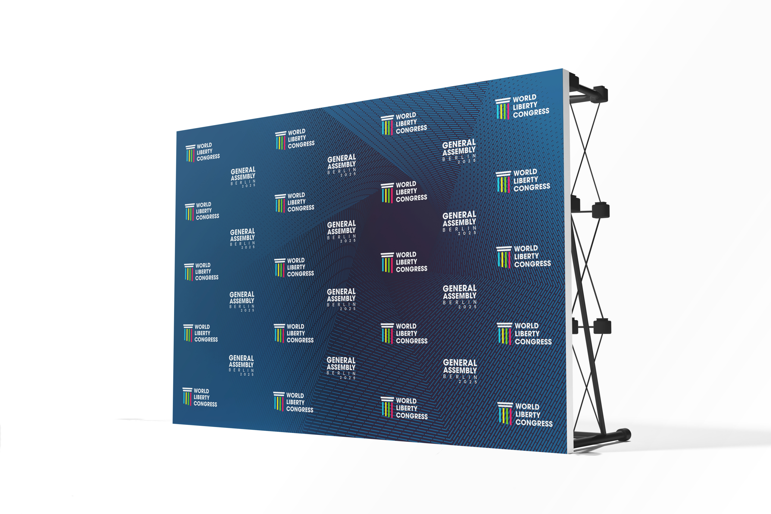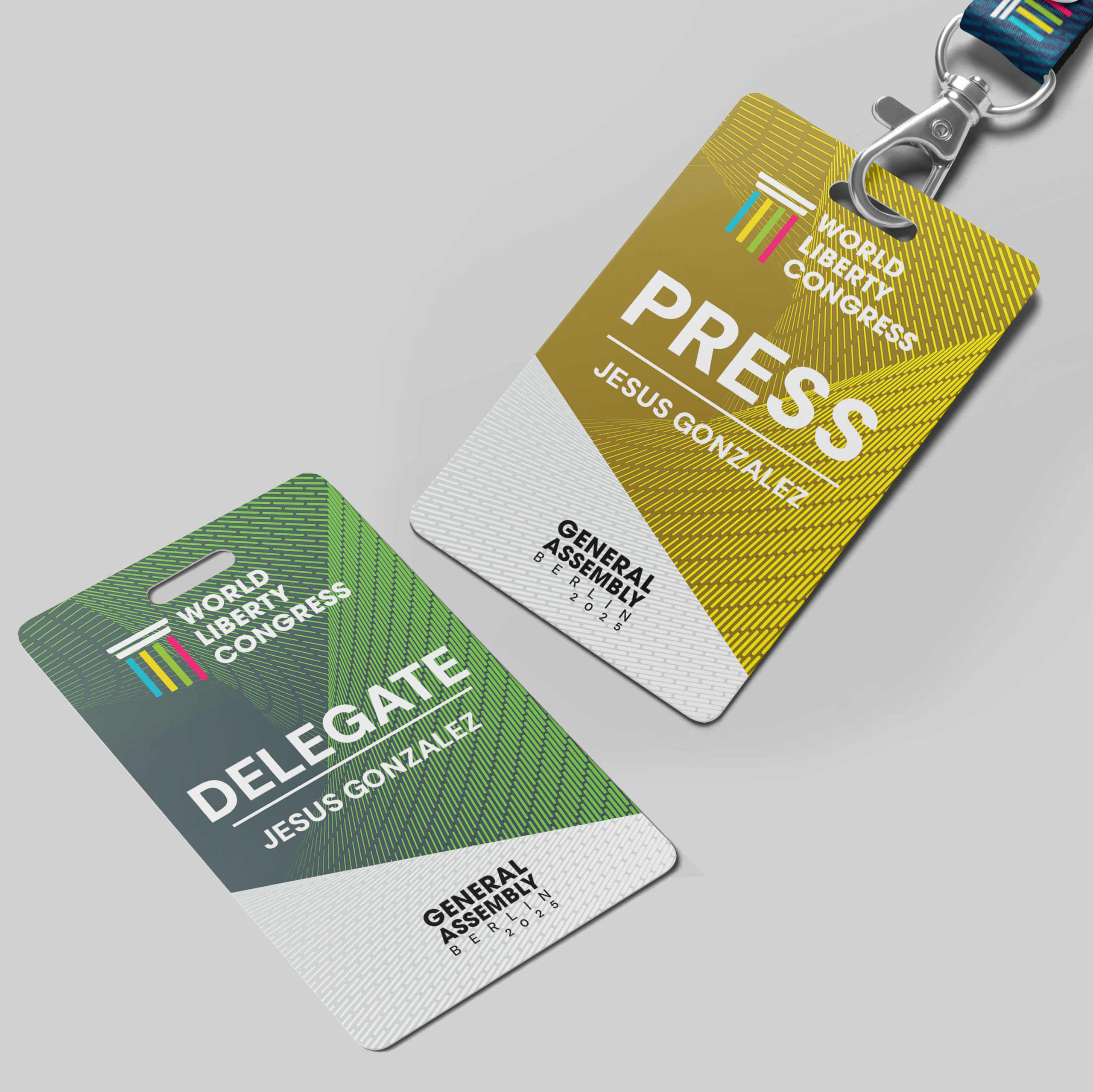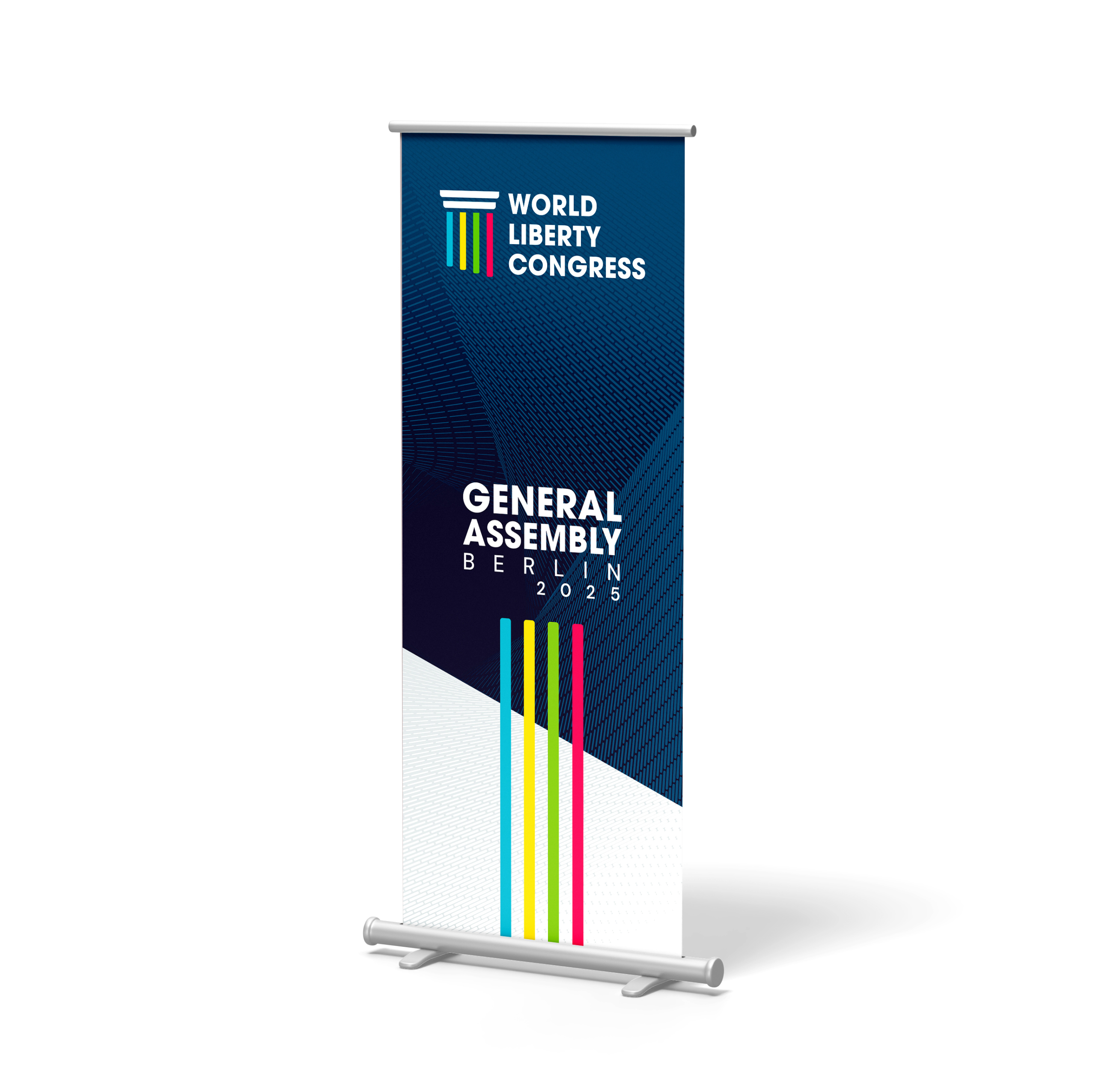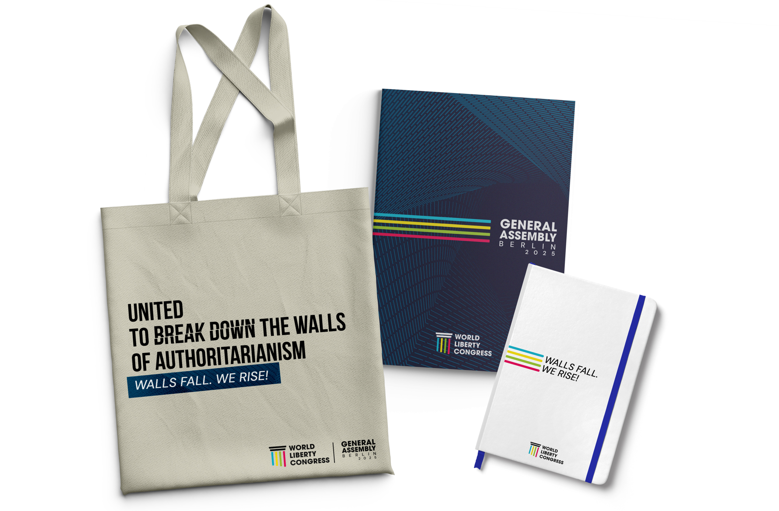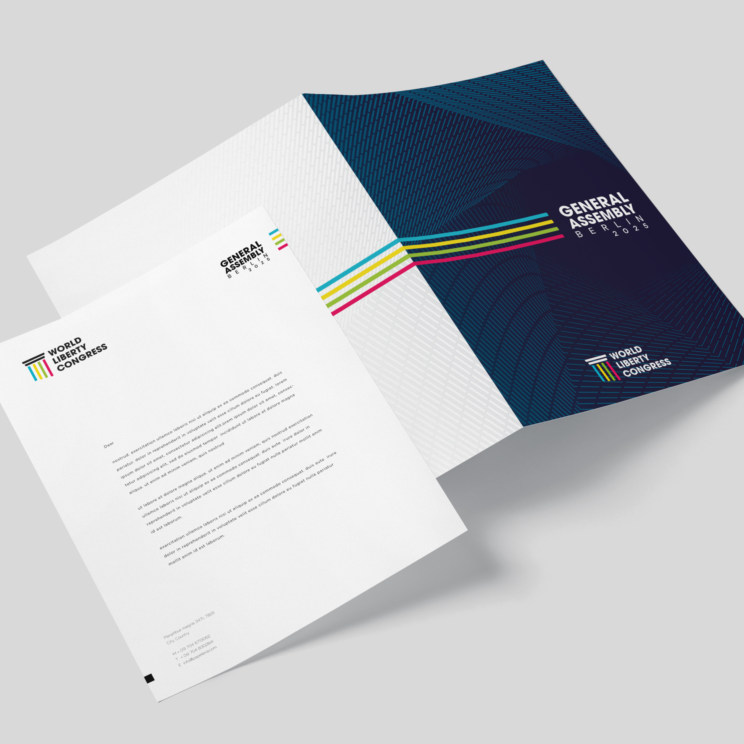 I was responsible for both the design and the production of the complete visual identity for the WLC General Assembly 2025, hosted during Berlin Freedom Week. The objective was to create a unified and versatile visual system for this biannual gathering, ensuring a coherent and recognizable identity across all event materials. This included credentials, promotional assets, banners, stationery, notebooks, folders, apparel and on-site signage.